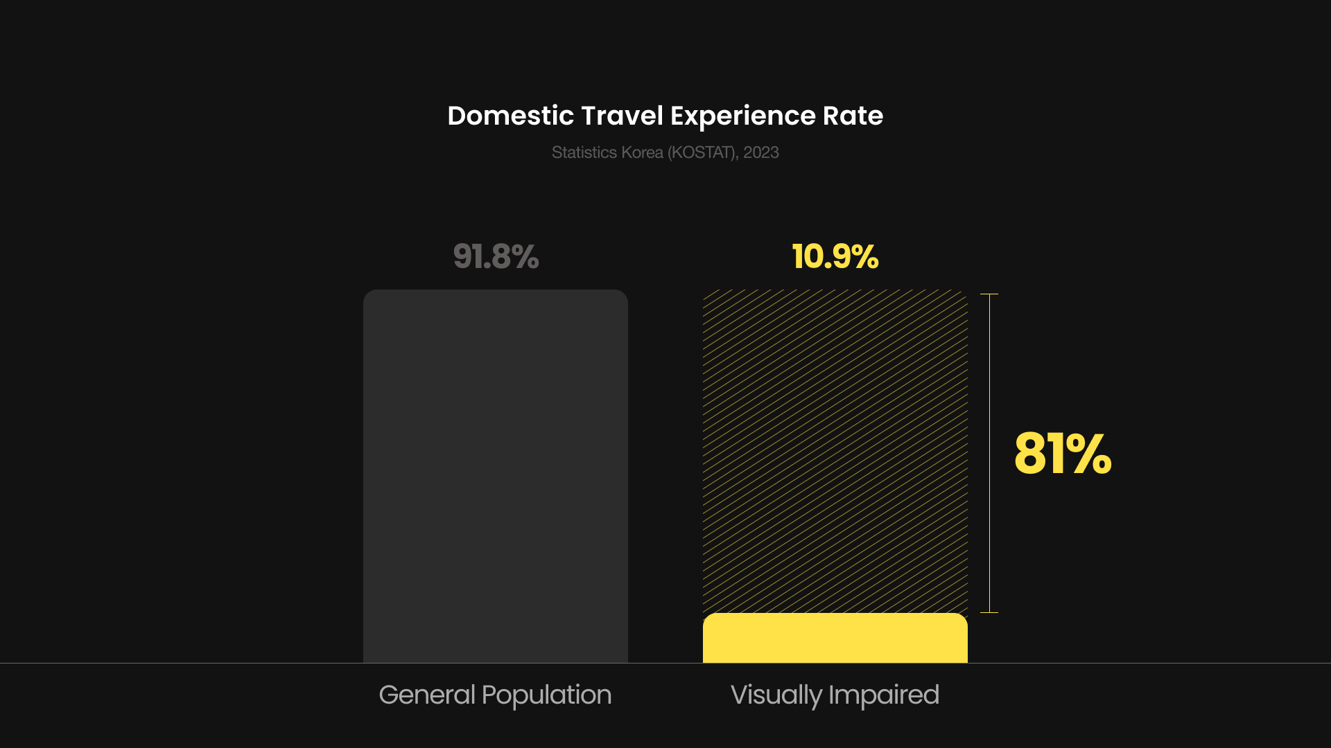 In South Korea, the domestic travel participation rate of visually impaired individuals was only 10.9% in 2023. Compared to the national average of 91.8% in the same year, this is about 81% lower and shows a serious lack of access to leisure and cultural activities for people with visual impairments.